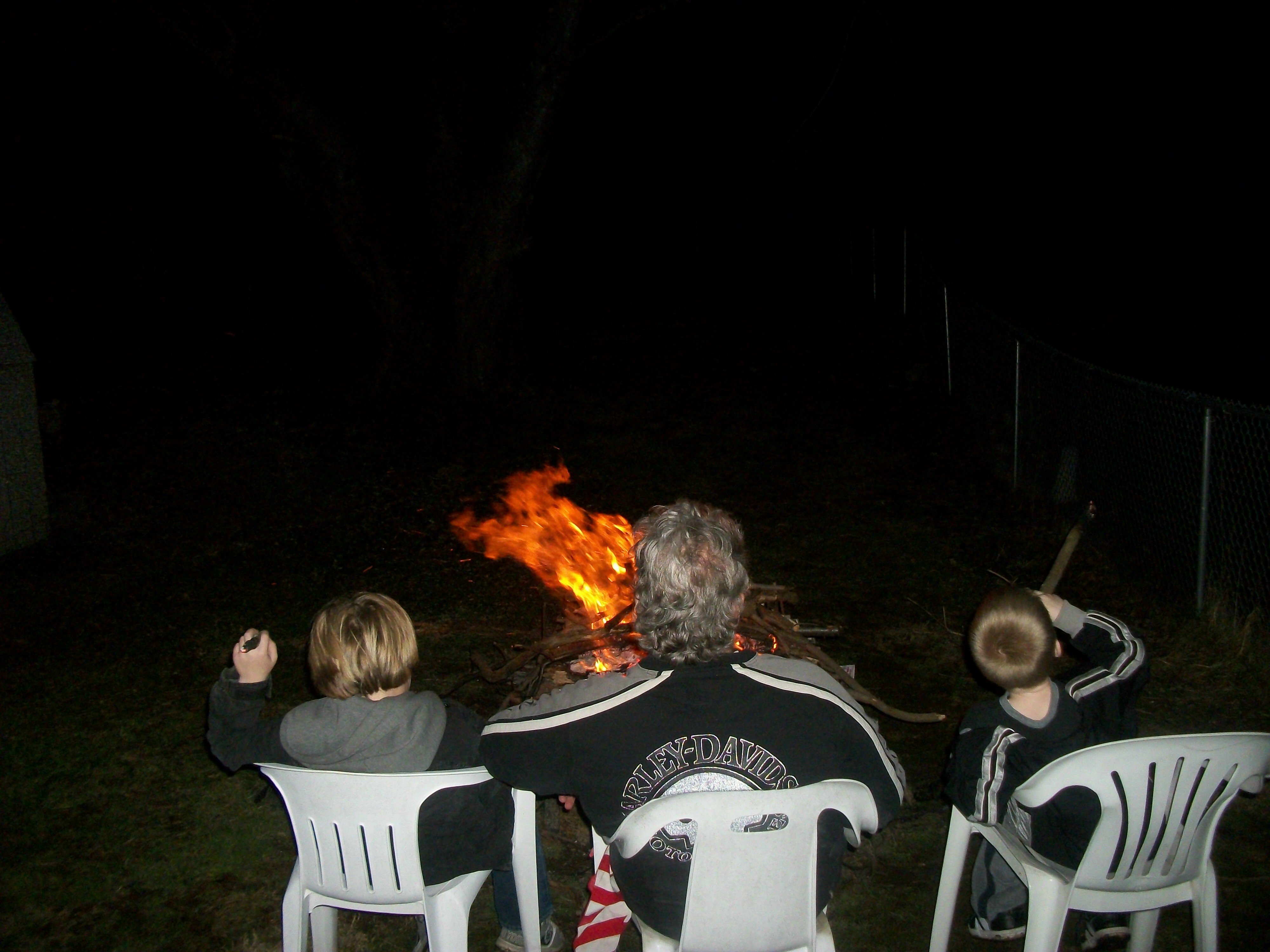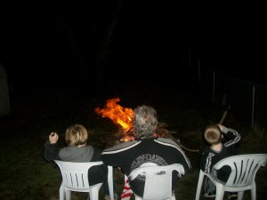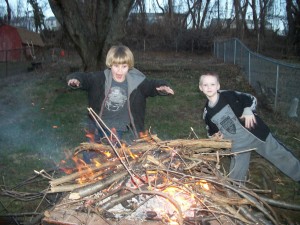 Last weekend we had our grandson’s Dominic (8) and Jimmy (7) for the weekend.  They helped Pop-Pop gather all the lost branches in our back yard and then they built a fire and had a guys night.  I stayed out of their way….