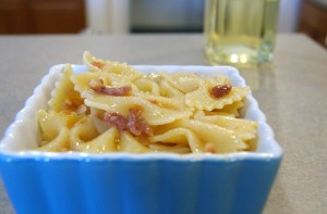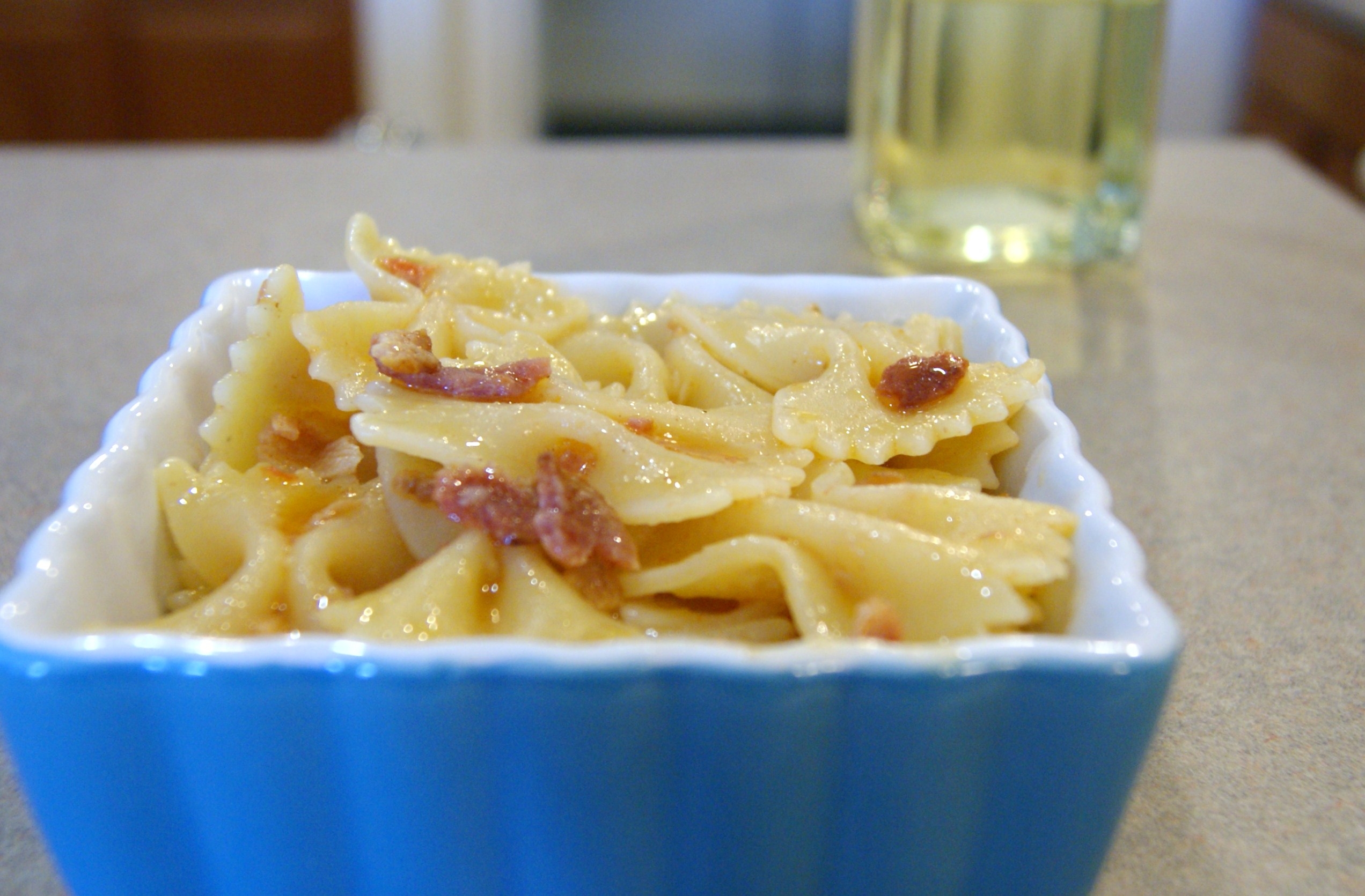 Use one box of bow-tie pasta (cooked and drained), one package of bacon (cooked and chopped) and toss wth olive oil, parmesan and garlic salt.