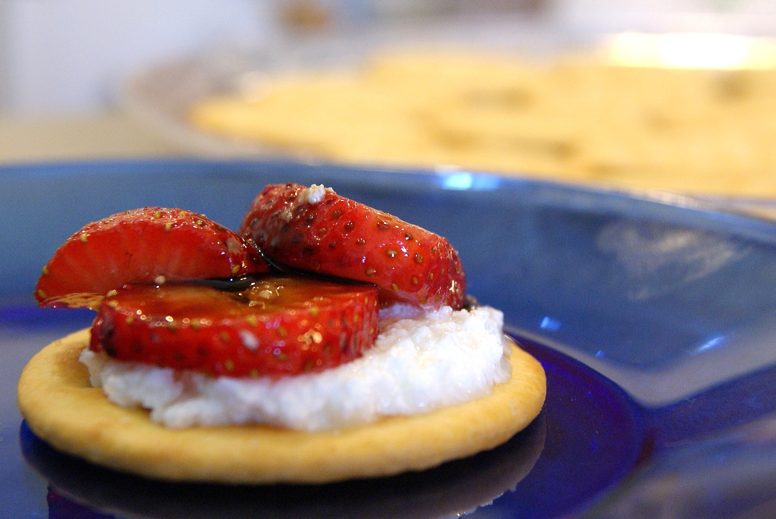 Slice the strawberries and soak them in the reduction overnight. Layer the ricotta then strawberries on a butter cracker then drizzle with balsamic reduction. Click here for a balsamic reduction recipe.