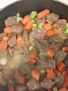 Pour the oil into a large skillet and heat. Add garlic and onion. Stir for a minute and add beef cubes. Brown all sides of beef. Add celery and carrots. Simmer for 5 minutes stirring often.